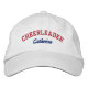 Boné branco de algodão, com CHEERLEADER de leitura de texto bordado vermelho, em forma leve de arco. Texto bordado azul adicional, sob texto de Cheerleader, está pronto para personalizar. Excelente para cheerleaderes e treinadores de torcida.
