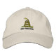 "Não Passe Em Mim" Bordou O Chapéu. Gadsden Flag, símbolo histórico patriótico e libertário da Guerra Revolucionária com cobra. A bandeira Gadsden é uma bandeira histórica americana com um campo amarelo que representa uma cascavel em espiral e pronta para atacar. Posicionado abaixo do cobra é a legenda "Não me pise". A bandeira foi desenhada por Christopher Gadsden e é nomeada por um general americano e estadista. O uso da cascavel madeireira como símbolo das colônias americanas pode ser rastreado até as publicações de Benjamin Franklin. Em 1751, fez a primeira referência à cascavel em um comentário satírico publicado em seu Boletim da Pensilvânia. Era a política da Grã-Bretanha enviar criminosos condenados para a América, e Franklin sugeriu que eles obrigados os britânicos enviando cascavéis para Inglaterra. Considerada uma das primeiras bandeiras dos Estados Unidos, a bandeira foi posteriormente substituída pela atual bandeira Estrelas e Stripes (ou Velha Glória). Desde a Revolução, a bandeira viu os tempos de reintrodução como um símbolo do patriotismo americano e como um símbolo de discordância com o governo.