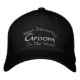 Um bordado branco na moda em um boné preto de smoking irá ajustado qualquer cor de casamento. O noivo vai parecer excelente e se sentir legal. Divertido para a despedida de solteiro, a recepção após o grande evento ou durante o seu tema.