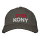 Um chapéu azul escuro com letras claras vermelhas e brancas proclamando a mensagem STOP Kony.
