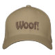 Boné de beisebol com a palavra "Woof!" bordada na frente.