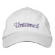 Um boné de beisebol branco e divertido personalizado, bordado em roxo com a palavra Untamed. Uma ideia inspiradora de presente de aniversário.