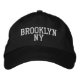 Mínimo BROOKLYN NY White bordado em um chapéu de algodão preto. O bordado branco é personalizável para outras opções de cores selecionando o botão da ferramenta "Editar Design". Também está disponível a opção de selecionar essa cor na página do item principal.