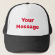 Você pode criar sua própria mensagem em um texto vermelho brilhante neste chapéu de caminhoneiro preto e branco.