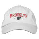 Preppy BROOKLYN NY Red e Black bordados em um chapéu de algodão branco. As cores do bordado são personalizáveis para outras opções de cores selecionando o botão da ferramenta "Editar Design". Também está disponível a opção de selecionar essa cor na página do item principal.