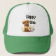 Cachorro bonito com flores e texto FELIZ UM
