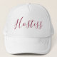 Uma recordação cuidadosa para a sua anfitriã, este chapéu branco de caminhoneiro que apresenta "Hostess" escrito na frente com letra burgundy. Compre hoje!