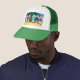 Um chapéu de caminhoneiro verde e branco, decorado com um design de colagem de papel pintado à mão de cabanas de praia.