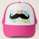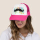 Chapéu de caminhoneiro branco, cor-de-rosa-quente, com gráfico de bigode, e um fundo de cinturas brilhantes do arco-íris, uma fina faixa de cor entre adolescentes ou mulheres. Divertido, fresco e vibrante.