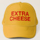 Diversão EXTRA CHEESE e slogan irônico no chapéu de caminhoneiro, uma declaração tipográfica vermelha e engraçada, inspirada pelo personagem de comédia de tv frank rossitano. sempre.