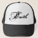 Fé em uma pia batismal coberta no chapéu preto e branco do camionista.