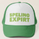 Divertimento de SPELING EXPIRT e slogan irónico no chapéu do camionista, verde, indicação tipográfica engraçada, inspirada pelo rossitano da franquia do caráter da comédia da tevê.