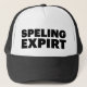 Divertimento de SPELING EXPIRT e slogan irónico no chapéu do camionista, preto, indicação tipográfica engraçada, inspirada pelo rossitano da franquia do caráter da comédia da tevê.