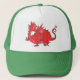 Um chapéu de caminhoneiro verde e branco com um lindo Dragão Vermelho galês sobre fundo branco, de uma ilustração feita a aquarela por Judy Adamson.