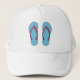 Uma ilustração de um par de chinelos de praia cor-de-rosa e azuis. É verão! O vamos faz uma pausa e diverte-te debaixo do sol. Você não está animado em preparar suas coisas para as férias? Não esqueça seus chinelos.