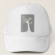Cinco adoráveis pássaros abstrato-amarelos saem em uma árvore branca contra um fundo de cinza em um chapéu
