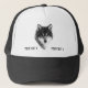 O lobo-Cinza Canis lupus retrato em preto e branco. Um chapéu de caminhoneiro elegante para qualquer um. Personalizável. Você pode alterar ou excluir dois textos na imagem. Você também pode transferir este design para outro produto de sua escolha, basta usar uma opção à direita desta descrição.