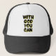 Este design tem as palavras "Com Deus, Você Pode" em um estilo de bolha impressão, mais letras negras e contornos de sombra amarela com um estilo de tipografia neste tema baseado na fé. Este chapéu é confortável, casual e ajustável de 17 a 24" com um excelente de 100% de espuma de nylon frente e de nylon para uso diário ou em qualquer ocasião especial.