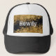 Este é um Chapéu Glitter Howdy Luxe Dourado e Preto. O design luxo foi criado com arte gerativa. O at apresenta brilho dourado falso espalhado por um fundo preto sujo de brilho. A brilha dourada tem um brilho luxuoso e a brilha preta tem um acabamento mate. A palavra Howdy está na frente do chapéu em grande texto prateado.