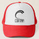 Um vermelho um chapéu branco com um preto contra "C" nele. Abaixo do logotipo diz contra.
