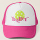 Um chapéu de caminhoneiro cor-de-rosa brilhante com cores amarelas brilhantes editáveis ícone de picleball e "chamariz" em uma fonte de bloqueio de serifa, perfeito para a garota ou mulher do jogador de picleball.