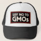 Boné de beisebol com um sinal que leia: Diga não aos GMOs.