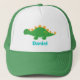 Um chapéu com um dinossauro de Stegossauro verde giro que tem picos amarelos para blindagem. Excelente para quem ama temas pré-históricos, Jurássicos ou dinossauros. Personalize com o nome ou a mensagem do s.