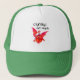 Um chapéu verde e branco com um design de colagem de papel pintado à mão de um dragão vermelho e o slogan 'Cymru am Byth', 'Wales Forever!' em galês.