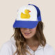 Simples ilustração gráfica de um bonitinho pato amarelo de desenho em água azul sobre o chapéu. Este pato é a Imagem disponível em vários presentes e produtos. Personalize e escolha a sua própria cor de fundo do pato ou adicione texto, se necessário.