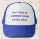 Este chapéu engraçado diz "Mais provável de desencadear acidentalmente uma maldição de mau" na frente, em na moda azul escuro e roxo, e "Desculpe, eu disse acidentalmente?" na parte de trás. É perfeito para arqueólogos, historiadores, aventureiros, ou simplesmente amigos com paixão pelo horror... e um lado negro oculto que adoraria soltar mau antigas sobre seus inimigos, é claro. Ou simplesmente para ver o que aconteceria. Você sabe que está se perguntando sobre isso. Então, se você é um egitologista que acabou de abrir um sarcófago negro, ou um aficionado trekking que rotineiramente se perde em florestas infestadas de bruxas escuras, ou um amante de antiguidade que iria comprar um livro antigo, parecido com pele humana, em um compro de livros empoeirados escuros.. pelo menos avise seus amigos com este chapéu!