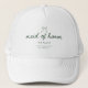 Elegant Coquette Script Maid of Honor's Name Trucker Hat. A modern and minimalistic, olive green and white "maid of honor" trucker hat, designed with script lettering, and a coquette bow. Personalize with your maid of honor's name, bachelorette or wedding location, and date if desired.