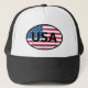bandeira Oval americana emblem Trucker Hat. Sinal de abreviação de código do país típico para carros. Crie seu próprio boné personalizado. Adicione seu próprio texto ou monograma. Design de forma oval ao estilo clássico europeu. Bandeira dos Estados Unidos da América. Estrelas patrióticas e design de listras. Cor branca vermelha e azul. Ideias de presente únicas para ele ou para ela.