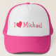 Eu adoro o boné de baseball Michael com um design de coração rosa quente.
