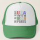 Leituras, em caracteres viscosos, FEITAS NOS EUA COM PARTES IRLANDESAS. Os EUA mostram em letras vermelhas, brancas e azuis. O irlandês aparece em verde, branco e laranja. Escolha entre várias cores de chapéu, esta mostra em verde.