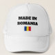 "Feito na Romênia" em letras negras e a bandeira romena num chapéu branco de caminhoneiro.