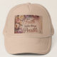 This hat features a circular floral wreath design with a soft aesthetic. The wreath is composed of white garden roses, pale pink roses, lavender roses and cream-colored flowers arranged in a circular pattern. Baby's breath creates a soft, ethereal background texture throughout the wreath. The center of the wreath contains elegant script in rose gold that reads Faith makes things Possible. The background is a soft, gradient gray color that transitions from light to darker tones. Small golden stars and sparkles are in the image, creating a magical, ethereal effect. The wreath is framed by a golden circular border like the curve of the arrangement. The composition has a dreamy, inspirational quality with soft pinks, lavenders and creams color palette. The hat is a khaki color.