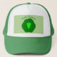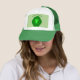 Este chapéu espetacular apresenta um desenho fofo de um broche verde com grandes olhos e um sorriso. Tem folhas verdes escuras ao redor do exterior e uma dentro verde-paler.