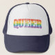 Esta imagem retrororgulho gay tem a palavra "estranho" em letras do arco-íris com uma textura vestida.
