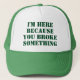 You can easily change the words on the hat if you can think of something better. Leave this as is, and you have a funny hat that says 'I'm here because you broke something.' Makes the perfect personal gift for someone who loves wearing hats!