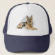 Este chapéu de caminhoneiros, mostra o meu retrato de um adorável German shepherd preto e bronzeado. Estes lindos cães apareceram na minha família ao longo dos anos, e são um dos meus cães favoritos.