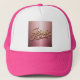 This hat features Jesus in elegant cursive script in metallic gold with a glossy, three-dimensional effect. The background transitions from a lighter rose gold at the top to a darker rose gold pink at the bottom, creating a gentle gradient effect. The hat is a pink and white trucker hat.