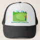 Boné de basebol de golfista. Foto de um Cartoon Divertido de Golfe Jogando Golfe e está no verde, mas perde um ponto. Caddy está segurando a bandeira.