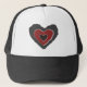 Este chapéu espetacular apresenta uma bela imagem digital de um coração gótico, preto e vermelho, com bordas irregulares que brilham com uma luz etérea e parecem estar derretendo.
