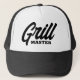 Grill Master trucker hat for BBQ party chef. Custom black and white baseball cap with script typography. Stylish hand lettering design for grillmaster. Available in cool colors. Add your own humorous text optionally. Fun summer Birthday gift idea for dad, husband, boyfriend, uncle, grandpa, friend, bos, coworker, colleague, retiree etc.