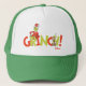 This vibrant and bold graphic is the perfect logo for the holiday mischief-maker! The word "GRINCH!" is displayed in large, stylized letters, primarily in festive red and lime green. The Grinch himself (in his Santa suit) stands right over the letters with his hands on his hips, looking mischievously proud. Beside him, his loyal partner, Max the Dog (complete with reindeer antlers), sits patiently. This fun graphic is a great way to celebrate the iconic characters and their story!