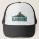 Moin! Confira este "Trucker Hat" na moda que mostra a linha do horizonte da cidade alemã de Hamburgo Alemanha com todos os famosos marcos como Elbphilharmie, Speicherstadt, o porto de Hamburgo ou Michel. Para cada ideia incrível de presente de Hamburger.