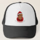 Chapéu de beisebol com ilustração de um homem afro-americano ou hispânico com cabelo preto curto e chapéu vermelho de Papai Noel; em círculo vermelho sobre fundo branco, com modelo de texto personalizável para seu nome ou mensagem