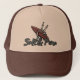 Deseje nosso chapéu de caminhoneiro do Tempo de Cowabunga, com um sinal de paz esqueleto e conselho de surf em cor verde e laranja queimada.