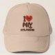 Eu adoro o chapéu de caminhoneiro personalizado do meu namorada que é doce e fonte viva que diz "Eu adoro o meu namorada" e um coração gigante e cores claras