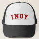 Verifique para fora este chapéu de Indy! É você de Indianapolis, Indiana? Você tem um amigo ou um membro da família que amem Indianapolis, Indiana? Em caso afirmativo, este chapéu da "bandeira" é exatamente o presente que você está procurando! As características de design "Indy" na rotulação vermelha arqueada na pia batismal clássica da faculdade.
